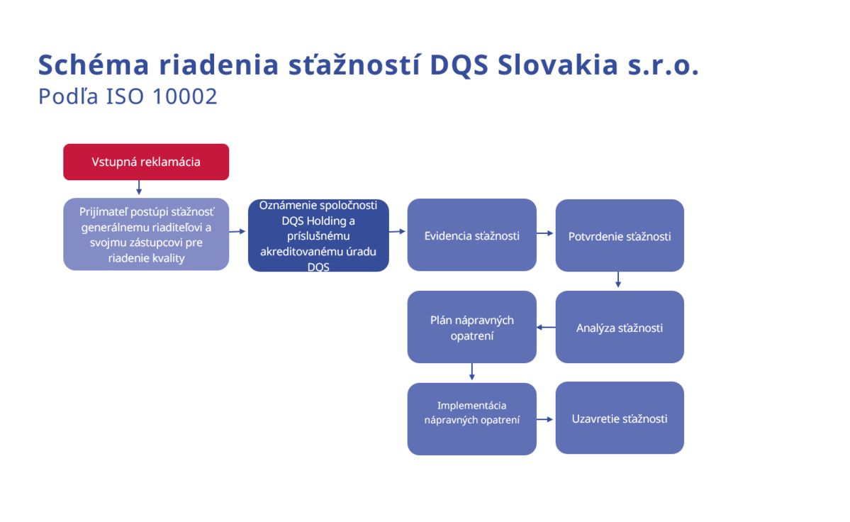 Stížnost je vyjádření nespokojenosti, jiné než odvolání, jakoukoli zainteresovanou stranou vůči DQS, týkající se certifikačních činností DQS, jejích zaměstnanců, zástupců a auditorů nebo jejích certifikovaných zákazníků DQS, kdy se výslovně nebo implicitně očekává formální odpověď.