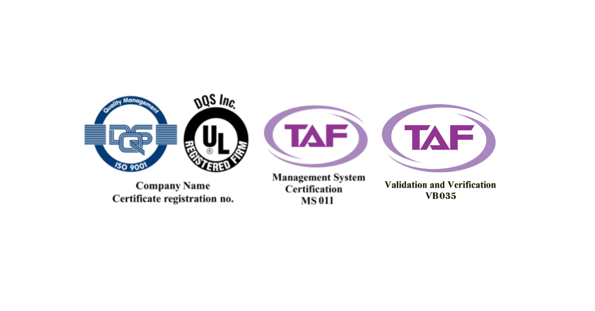 DQS Taiwan 取得 TAF 認證標章,顯示於 ISO 9001、ISO 45001與 ISO 14064 證書上。